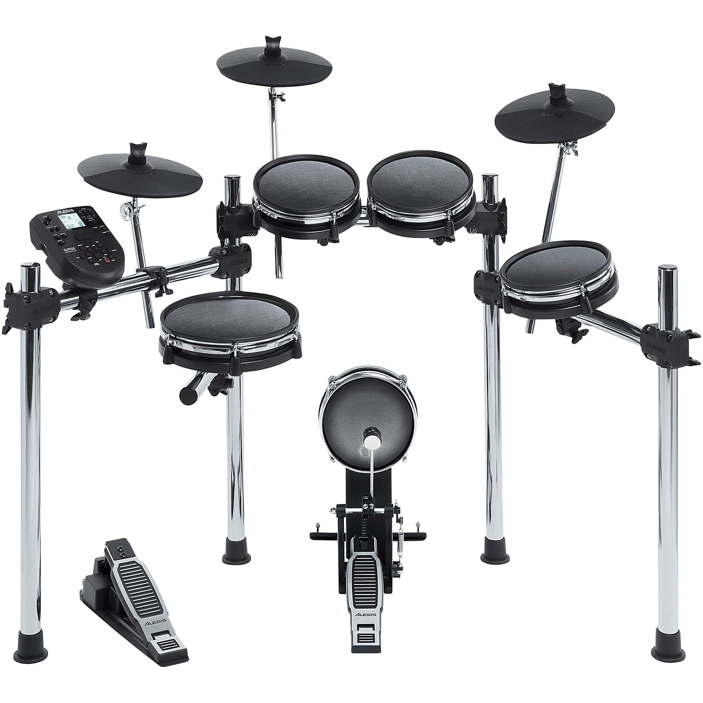 The Alesis Surge Mesh-Head Kit is a complete 8-piece electronic drum kit featuring dual-zone mesh head toms, dual-zone mesh snare drum, and 8” mesh kick pad. Mesh head drums are the proven best choice with electronic drummers for their natural feel and ultra-quiet response. Alesis rounds out the kit with three cymbals, kick drum pedal and hi-hat pedal. These all mount to an included 4-post chrome rack that is quick and easy to assemble. The included cable snake conveniently connects this drum kit to the powerful Alesis Surge electronic sound module, with hundreds of percussion sounds, 40 different kit (24 Preset + 16 User), 60 built-in play-along tracks and an auxiliary input so you can play with your favorite music.