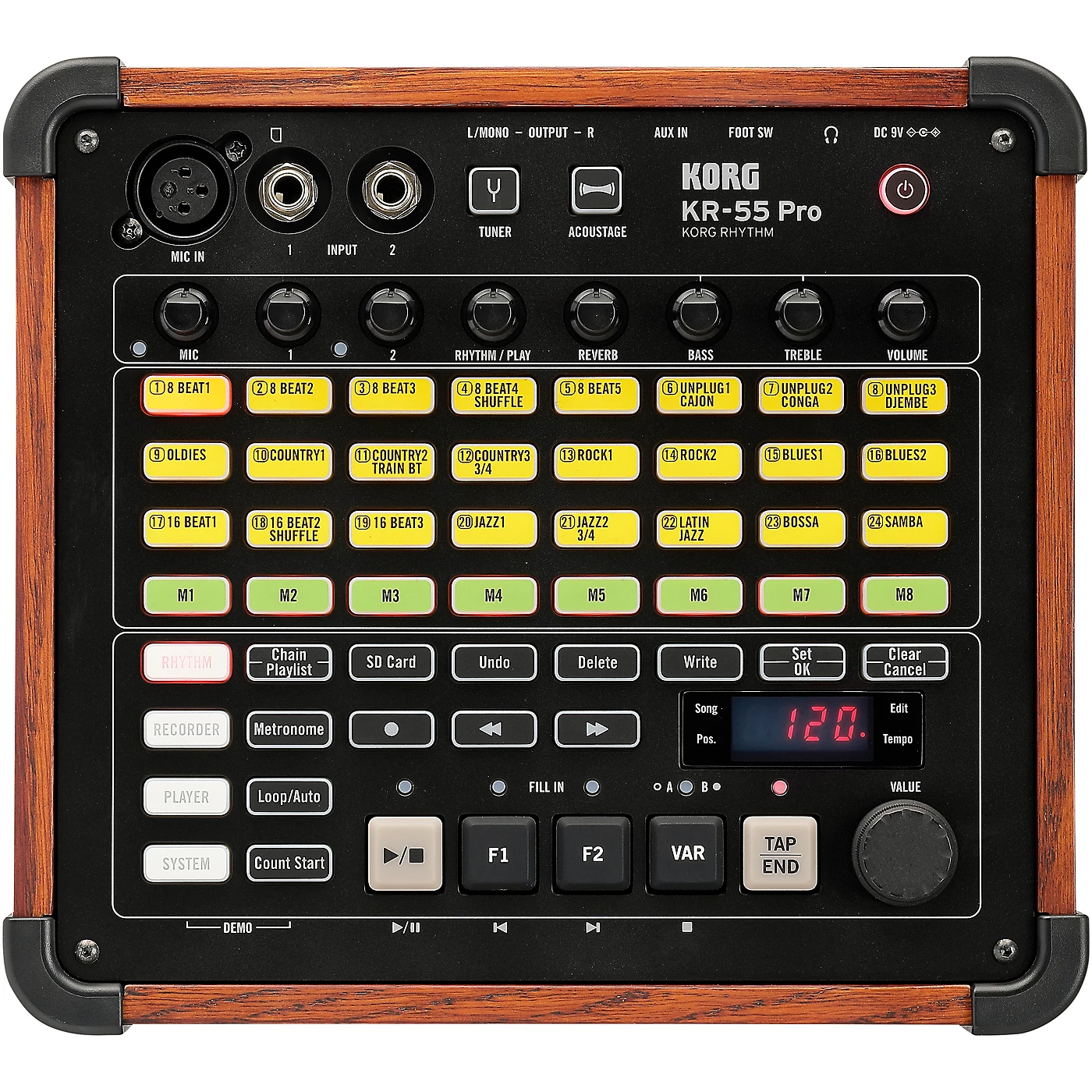 Experience the same musical support as if a pro drummer were sitting in on your session. The KR-55 Pro gives you an easy way to enjoy jam sessions with the backing of real drum/percussion sounds. It provides a rich variety of input jacks, mixer functionality, effects, and equalizer, as well as a versatile recorder that can record to an SD card. The intuitive interface means that there’s no need for complex programming. Battery-powered operation allows complete mobility from desktop to street performances, or use in a variety of situations including live events in small spaces.Real Groove TechnologyThe KR-55 Pro features “Real Groove Technology” which uses data recorded from actual professional musicians performing at various tempos, and is a completely different technology than conventional rhythm machines. There are a total of 24 high-quality rhythm styles, each fine tuned to provide the best possible feel, to accurately reproduce the experience of playing with a percussionist. The sounds, grooves, and phrases will play back at pristine quality even if you change the tempo, so you can enjoy playing serious jam sessions at your own pace.Create Sophisticated RhythmsEach rhythm style includes a wide variety of patterns: two variations in addition to basic, fill-in 1, and fill-in 2. This means that the KR-55 Pro can provide the accompaniment for an entire song. By using the chain function, which lets you put together and memorize a different rhythm style for each measure, you can freely create even complex rhythm tracks. Up to 30 banks of chains can be stored, and each chain can be up to 999 measures long.Flexible I/O and Mixer FunctionalityThe KR-55 Pro provides a rich array of input jacks that accommodate a variety of instruments: a guitar or bass can be connected to Input 1/2, and the XLR jack accepts a mic input. You can let the KR-55 Pro take care of the rhythm, and enjoy a full-band performance with guitar, bass, and vocals. A reverb effect can be applied to each input source, and Treble and Bass equalizer are also provided so that you can shape your sound in detail. The AUX INPUT supports stereo, and can be connected to a digital audio player, a keyboard, or an effect unit that’s equipped with stereo output. Together, they allow you to use up to four channels.Versatile Multi-Track RecordingIn addition to built-in rhythm styles, the KR-55 Pro is equipped with a versatile recorder function that can record a variety of input sources. You can record your own performances along with the built-in rhythm styles, a favorite song, or karaoke tracks that you created on your DAW. The recorded data can be exported as a WAV file to an SD card, so the KR-55 Pro is all you need to create widely-usable tracks. You can also multitrack-record your guitar and bass to produce more complex tracks. Also provided are editing functions such as undo/redo and punch-in, and you can also place markers at the desired location of the recorded data, and overdub while looping the playback.Audio Player and SD Card ReaderThe KR-55 Pro is equipped with an audio player function that can play back audio files (wav) from an SD card. You can take advantage of Acoustage and use this unit as a high-quality listening system, or prepare backing tracks for you to play along with. There’s also a playlist function (10 banks) that lets you manage the file playback order of up to 24 songs, so you can play back songs in a desired order for your live performance. In addition, the playback speed can be adjusted in the range of -25% to +25%, and you can also make files play repeatedly or automatically in succession. Whether you’re practicing at home or performing in front of an audience, the KR-55 Pro is packed with functions that will be useful in various situations.Built-In Tuner and MetronomeA tuner with the high precision that you expect from KORG is built in. When you turn this function on, the rhythm style buttons become a tuning meter, allowing you to tune with a large and easily visible meter. You can also tune while listening to a guitar, bass, or piano guide tone, or sound a metronome for convenient practicing.Wide Stereo ImageThe KR-55 Pro features “Acoustage,” proprietary virtual surround technology developed by Korg. This generates a wide stereo effect that appears to originate from locations that are broadly separated between left and right. (Note: Depending on the speakers, it might be difficult to notice this effect.) Acoustage is KORG’s original and revolutionary virtual surround technology that can create a unique personal acoustic space. Using only front stereo speakers, it can generate a three-dimensional acoustic experience that is unobtainable from previous systems.Convenient PortabilityIn addition to using the included adapter, the unit can also be powered by six AA batteries. Battery operation allows up to seven hours of continuous use, so the KR-55 Pro can be used even where an AC outlet is not available.