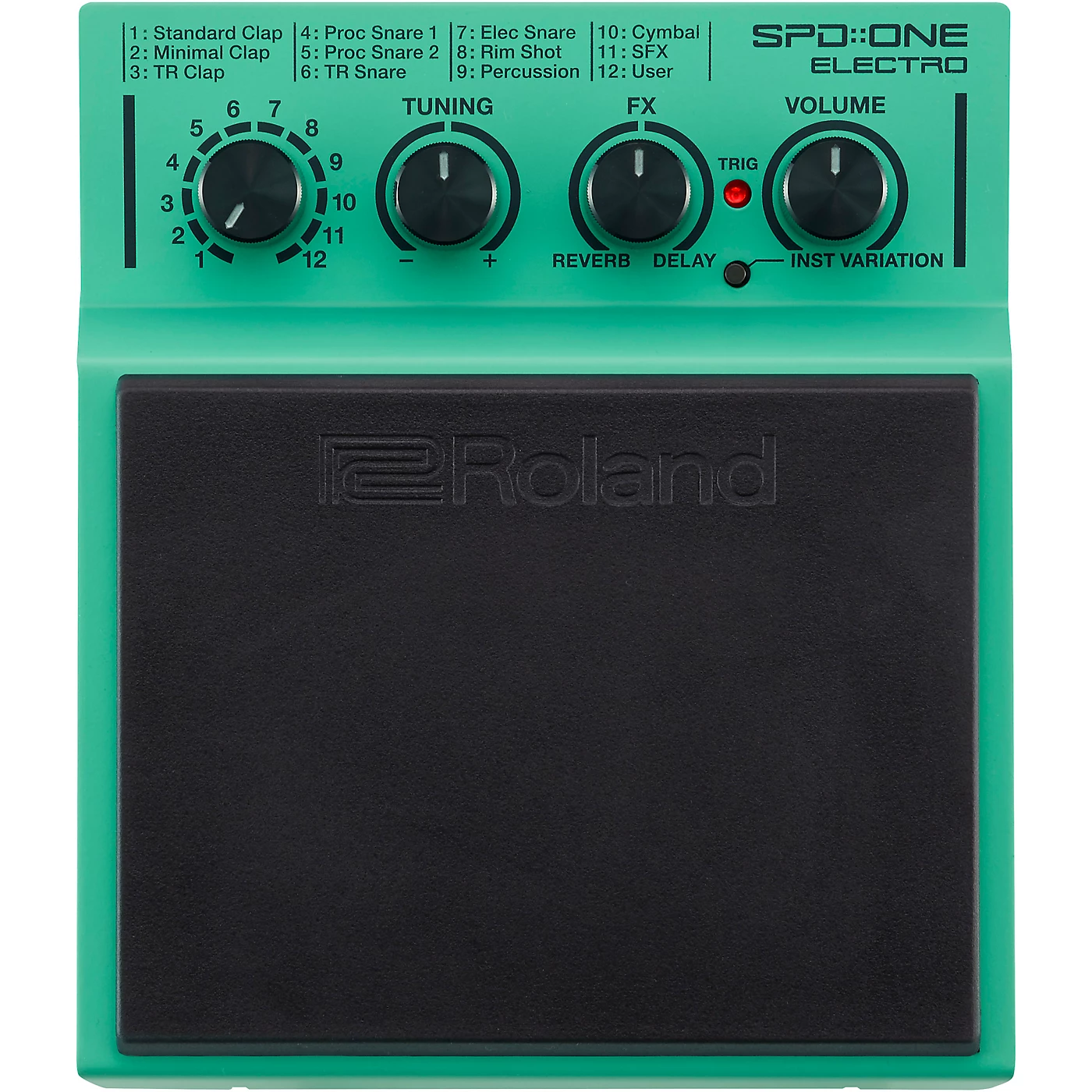 The Roland SPD::ONE ELECTRO is a new type of digital percussion pad, one that allows any musician to add electronic sounds to their performances. It contains 22 iconic sounds, including powerful 808 kicks, fat snares, crisp hand claps, electronic cowbells, and more, and you can even import your own original audio data into one of the 12 internal sound banks. Once you’re ready to go, the SPD::ONE ELECTRO’s robust-yet-sensitive pad can be played with sticks, hands, or feet, and the trigger threshold settings are easily adjusted with intuitive controls.Powered by batteries or AC, the portable SPD::ONE ELECTRO can be used on the floor or a tabletop, or mounted to any rig or drum setup with the included adapter. Operation is simple, even for those musicians who are not technical; just by using four knobs on the control panel, you can change the sound, volume, balance, and more. Whether you’re a drummer, percussion player, guitarist, DJ, or vocalist, the SPD::ONE ELECTRO is a simple and flexible way to expand your sound palette and invigorate your performances.A Digital Percussion Pad You Can Play with Sticks, Hands, or FeetEvery musician is individual, and your instruments need to complement your creativity and performance style. The SPD::ONE ELECTRO lets you play the way you want to; this compact digital percussion pad can be played with drumsticks, hands, or even your feet. What’s more, you can adjust sensitivity and trigger threshold settings in seconds using two control dials on the side of the unit. Drummers and percussionists will love the solid feel and natural rebound, guitarists can confidently stomp on the unit for four-on-the-floor beats, and practically any musician can play sounds by hand without fear of sore palms and fingers at the end of the night.Strengthen Your Backbeat with a Wide Range of SoundsThe SPD::ONE ELECTRO contains 22 iconic sounds, including drum and percussion sounds from Roland’s legendary TR-808 and TD-909 drum machines. Inside you’ll find 808 kicks, fat snares, 808 hi-hats, hand claps, and more. What’s more, the pitch of every instrument can be changed on the fly using a single knob. You can even add reverb or delay in seconds with a second knob. With the SPD::ONE ELECTRO, bolstering your backbeat with electronic sounds has never been simpler.Easily Fits Into Any Instrument SetupThe SPD::ONE ELECTRO is compact enough to fit into your existing instrument setup without needing to move your other gear. With the included mounting adapter, you can easily clamp the pad to a hi-hat, cymbal, or tom stand,* or even a mic stand. Alternately, the SPD::ONE ELECTRO can be played without mounting it to anything at all—simply place it on the floor, a tabletop, or any solid surface.*Fits percussion stand rod diameters from 8.0-12.7 mm.Portable and Built for the RoadYou can take the SPD::ONE ELECTRO wherever you want, thanks to its compact size and battery operation. It’s lightweight enough to be dropped into a bag or instrument case, and robust enough to travel thanks to its metal-body construction. You can even play and produce your own sounds on the move via headphones, and include them in your set list that night.Easy Control Using Just Four KnobsOperating the SPD::ONE ELECTRO is very simple. There are no complex submenus or button sequences—just select your sounds by turning the bank selector to any of the 12 positions, and hit the pad to play. With just four main knobs on the front panel, everything you need is at hand, including the ability to customize sounds, adjust overall volume, and balance levels on the fly.Enhance Your Performances with User Sample ImportThe SPD::ONE ELECTRO is loaded with iconic sounds, but sometimes you just need to use your own samples. Via USB, you can import WAV audio files up to five seconds long simply by dragging and dropping your files. Your sounds can then be modified just like any of the internal sounds using the tuning and effect control knobs. If you need to use sounds longer than five seconds, check out the dedicated SPD::ONE WAV PAD, which can handle up to 4 GB of WAV audio.Compact MIDI Controller for DAW Music ProductionThanks to its built-in USB-MIDI support, the SPD::ONE ELECTRO can be used as a compact digital pad controller for a computer DAW. This provides a great way to play software-based sounds and enhance your productions with realistic MIDI percussion tracks.