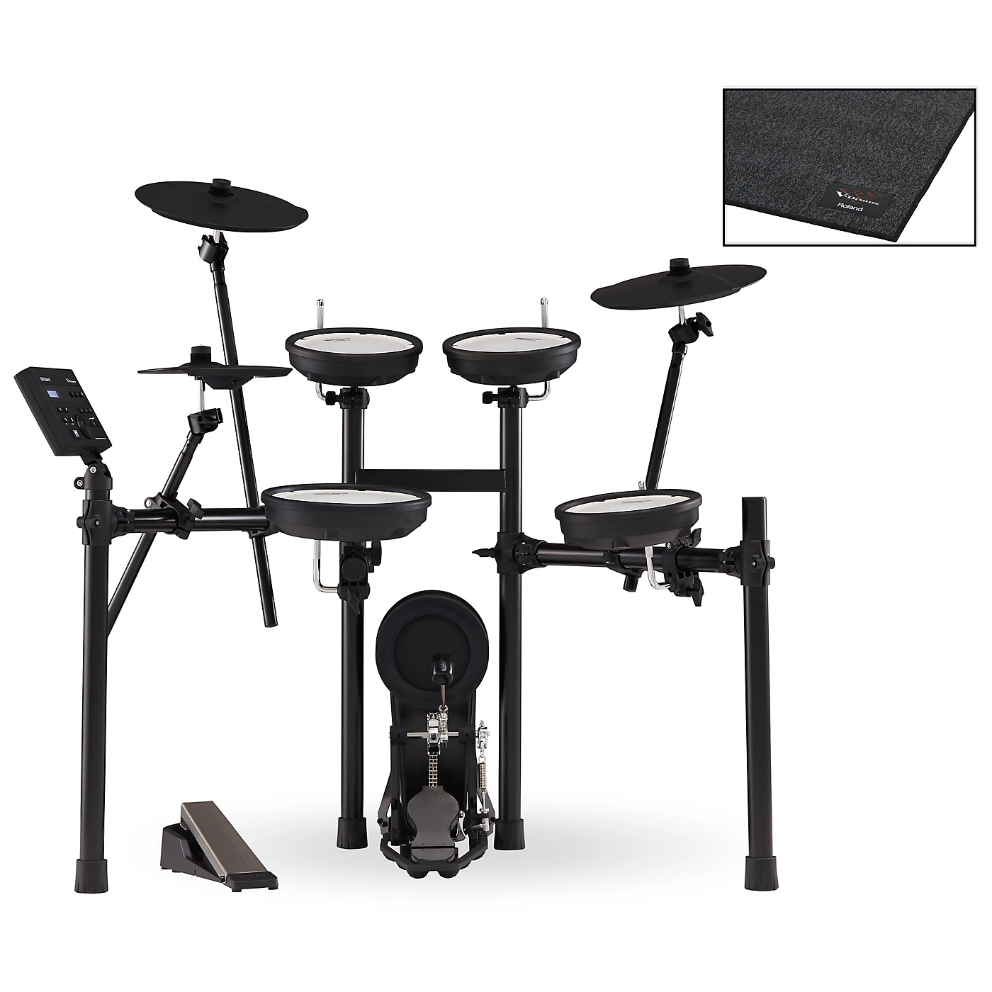 The Roland TD-07KV electronic drum set is compact, capable and surprisingly affordable, making it an appealing e-kit to serious students as well as gigging drummers who need to save space. It also comes with a TDM-10 drum mat. Prevent your drum components from slipping while simultaneously safeguarding your floor from scratches and reducing impact noise/vibration with the TDM-10 heavy-duty drum mat.Authentic Sounds Recorded in Professional StudiosThe heart of any great electronic drum set is a powerful, capable and speedy sound module—and the TD-07 meets these demands. At the player’s command are acoustic drums and percussion captured in precise detail in pro studios, brought to life with advanced V-Drums technologies that make them behave just like their acoustic counterparts. There’s a wide range of electronic percussion as well, plus the ability to personalize each and every sound to the drummer’s liking. Play Right Away—or Dive Deeper and CustomizeThe Roland TD-07 is filled with inspiring, ready-to-play preset kits for instant gratification right out of the box. And when players are ready for deeper exploration, a massive drum library awaits. Switch out one snare for another, mix up the toms, go large on the kick drum and swap heavy for light crashes and rides. Then tune the drums, add damping and change the ambient environment at will. For the finishing touch, use the module’s individual EQs to shape the drums to perfection—just as a pro sound engineer would do. The Roland TD-07 module contains 25 slots to save these perfectly customized kits, so the player can keep a library of personalized setups for every situation. Designed to Stay Quiet, No Matter WhatOne of the main advantages of choosing electronic drums for home playing is that they’re much quieter than acoustic drums. But not all electronic kits are created equal. The amount of physical noise they generate can vary greatly. Backed by decades of R&D, the Roland TD-07KV is purpose-designed to be much quieter than other e-kits. Mesh heads minimize pad noise without compromising stick rebound, and special damping in the kick pad reduces noise and vibration while retaining a satisfying, natural feel. Even the stand components are designed to reduce vibration and noise transfer to the floor. Roland offers a range of optional solutions to further reduce noise if needed. Acoustic Sound Players Can Feel in Their HandsV-Drums produce a rich array of tone colors, providing an inspiring musical experience that feels like playing acoustic drums. There are no static sounds triggered by every hit. Rather, thanks to advanced precision sensors, the TD-07KV’s drum and cymbal pads detect every tap, stoke, roll, flam and ghost note perfectly. Even cymbal chokes can be performed organically. This information is processed by the sound module on the fly, so that that exact correct tone is heard. Players aren’t meant to notice any of this technology at work—but when they close their eyes and start drumming with the TD-07KV, it’ll feel right.