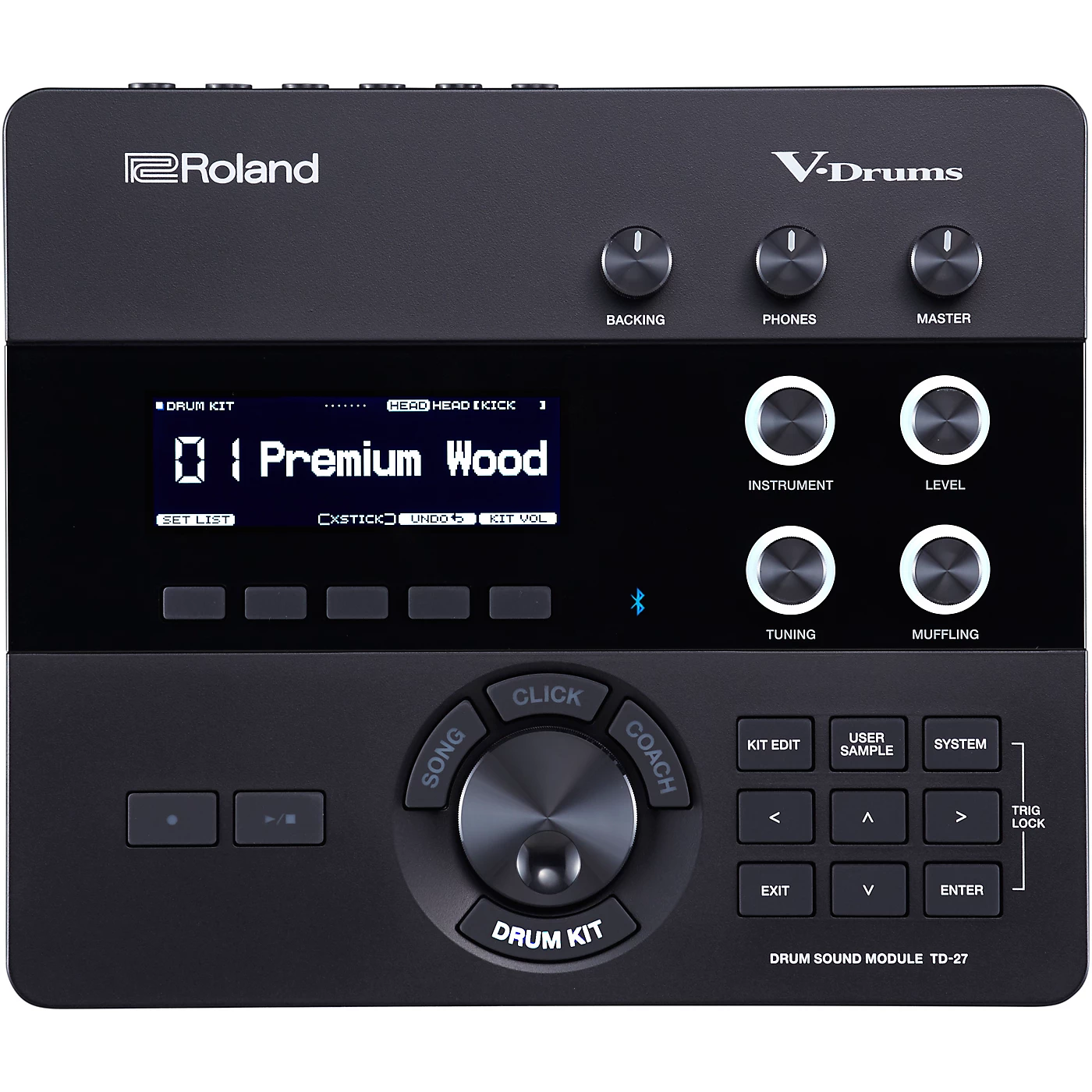 Flagship-Class Sound, Maximum ExpressionThe TD-27 V-Drums module is loaded with the finest acoustic drum sounds you’ve ever heard. Roland’s Prismatic Sound Modeling produces drums that not only sound exceptional, but also respond just like real acoustic instruments when you play them. Advanced digital trigger inputs support Roland digital pads for unmatched expression, while new PureAcoustic Ambience Technology offers a variety of inspiring drumming spaces at the touch of a button. A wide selection of electronic sounds from Roland’s rich sonic history are also included, providing must-have sounds for modern styles. And by loading and layering your own samples with internal drums, you’re able to craft sounds that no other drummer can claim. Incredible Prismatic Sound ModelingDerived from the flagship TD-50 module, the TD-27 is filled with drums that live and breathe like real acoustic instruments. We start by sampling the finest drums, percussion, and cymbals—both vintage and modern—in world-class recording studios. Roland’s unique Prismatic Sound Modeling is then applied to the samples, bringing them alive with proprietary behavior modeling refined over two decades. Every time you play a drum or cymbal in the module, you’re not simply triggering a canned sound—you’re playing a full-bodied instrument that responds like its acoustic counterpart in every way, putting unlimited sonic range at your command.Digital Trigger TechnologyRoland’s cutting-edge digital pad technology brings even deeper realism to the V-Drums experience. The TD-27 module features three digital trigger inputs, which work with advanced Roland digital pads like the PD-140DS snare and CY-18DR ride to deliver the most natural expression of your drumming. Multiple sensors and lightning-fast processing work together for truly amazing response, enabling you to play genuine techniques in the most natural way, with every nuance precisely detected and perfectly translated. And if you’re not ready for digital pads just yet, the TD-27 also has analog trigger inputs for standard snare and ride pads.Create (and Craft) Your Signature Drum KitWith an acoustic kit, you make the sound your own by swapping head types, adjusting the tuning, applying damping, tweaking the snare wire tension, changing out the kick beater, and more. This is all possible with the TD-27 module, with hands-on controls and deep editing options that allow you to craft customized kits for any situation. You can also load your own WAV samples via SD media, using them on their own or layering them with internal sounds.Pure Acoustic Ambience TechnologyNew PureAcoustic Ambience Technology optimizes each kit, creating an incredibly natural and immersive sound field when playing. But you can go deeper too, and adjust the mic position on each drum kit, and dial in the overall sound with the newly developed overhead mic simulator. Finally, advanced onboard multi-effects and mixing capabilities give you the power of a full-scale studio console, with transient, parametric EQs, compressors, reverbs, delays, and more at your command.Connectivity for Stage and StudioThe TD-27 is a powerful command center for any electronic drumming setup, with ample connectivity options for both stage and studio use. There are stereo outputs for the overall drum sound, plus two direct outputs for sending kick, snare, and other sounds to an audio console for independent mixing. The built-in USB audio interface makes computer music production simple, with up to 28 discrete audio channels available over a single cable. MIDI is also supported via USB and dedicated I/O, allowing you to sync with other MIDI devices and trigger sounds in computer software.Versatile Trigger SupportIn addition to its three digital trigger inputs, the TD-27 module features a multi-pin analog trigger jack for fast and easy connection with any standard V-Drums pad arrangement via an included cable. There’s also a dedicated analog trigger input for a second crash cymbal pad, plus three auxiliary trigger inputs for customizing your setup by adding Roland kick, tom and cymbal pads, or trigger pads like the BT-1. Bluetooth Connectivity and Built-In Coaching ToolsWith the practice features in the TD-27 module, you’ll always look forward to the next playing session. Built-in Bluetooth lets you wirelessly stream audio from a phone or laptop to the module, perfect for immersive jams with headphones. Play along with favorite music tracks or mix the sound from a YouTube lesson video with the kit. Onboard coach functions build skills and track your progress, while the advanced metronome helps improve your inner clock. And at any time, you can record your playing and listen back to hear what you need to work on.